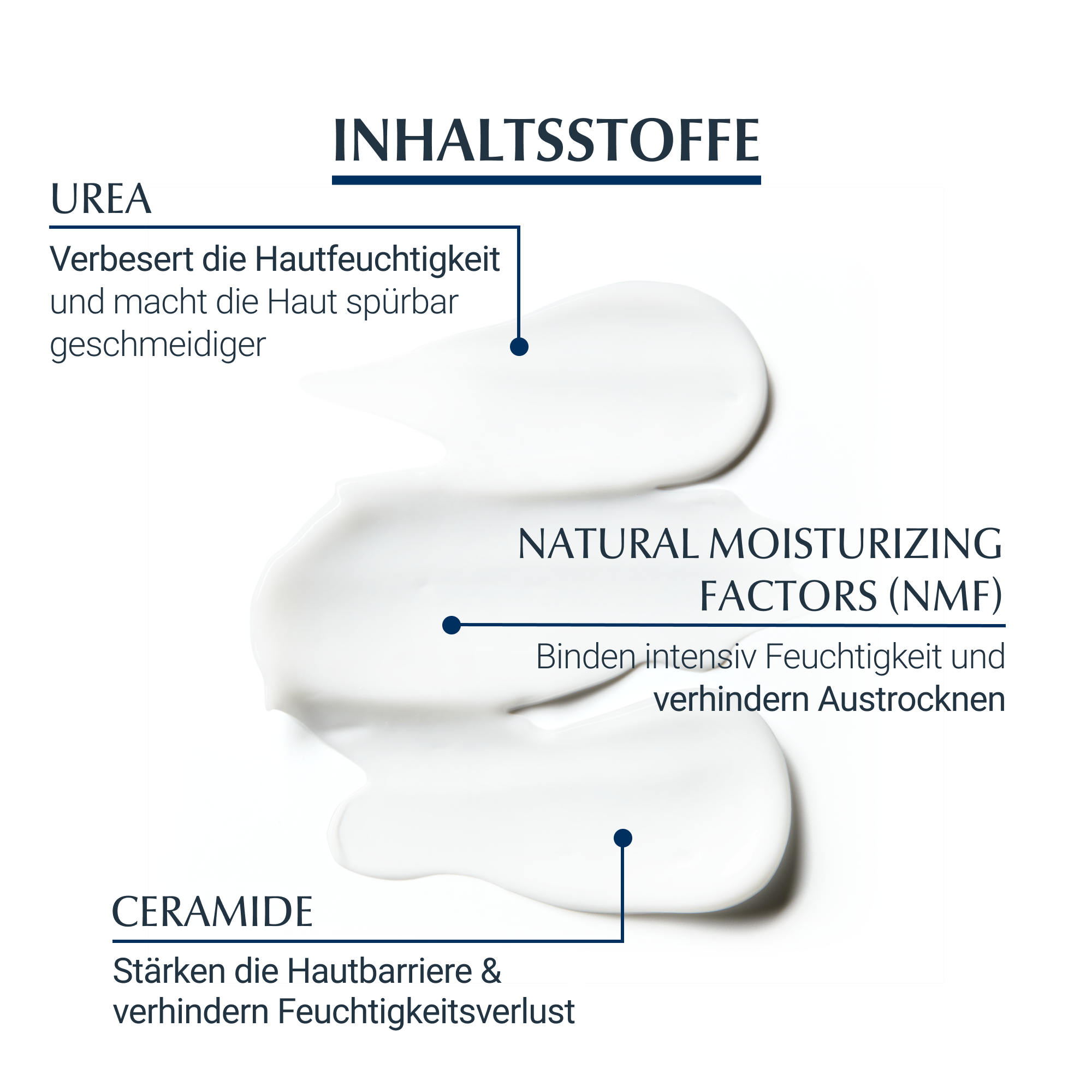 Urea gehört zu den Stoffen, die von der Haut zur Regulierung des Feuchtigkeitshaushalts gebildet werden – ein natürlicher Feuchthaltefaktor (Natural Moisturing Factor = NMF). Als hauteigener Wirkstoff wird Urea gut vertragen. Ceramide stärken die Hautbarriere, indem sie dazu beitragen, Feuchtigkeitsverluste durch Verdunstung zu verhindern und Reizstoffe abzuwehren, die Entzündungen und Juckreiz verursachen können. Die UreaRepair-Reihe bildet die natürliche Zusammensetzung der natürlichen Feuchtigkeitsspender gesunder Haut nach und gibt trockener Haut die Stoffe, die sie für eine optimale Feuchtigkeitsversorgung benötigt.